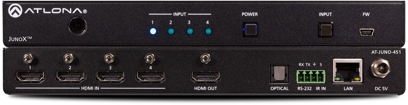 The Atlona JunoX™ 451 (AT-JUNO-451) is a 4×1 HDMI switcher for high dynamic range (HDR) formats. Part of the comprehensive family of Atlona 4K HDR integration products, it is HDCP 2.2 compliant and supports 4K/UHD video @ 60 Hz with 4:4:4 chroma sampling, as well as HDMI data rates up to 18 Gbps. The JunoX 451 is ideal for residential applications with the latest as well as emerging 4K/UHD and HDR sources and displays.Read More