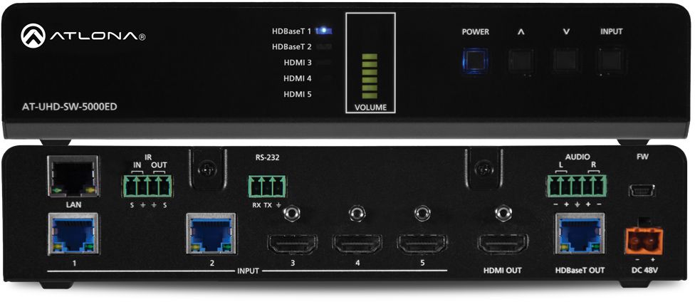 The SW-5000ED adds 4K/UHD performance and extended distance HDBaseT transmission to Atlona’s HDMI small switcher family for a unique solution for professional integration applications. Internal HDBaseT and video distribution eliminate the need for additional system components while PoE eliminates the need for a power supply for the receiver. As an alternative, with an HDBaseT-capable display, an HDBaseT receiver isn’t required, reducing system complexity and saving integrators time and money.
